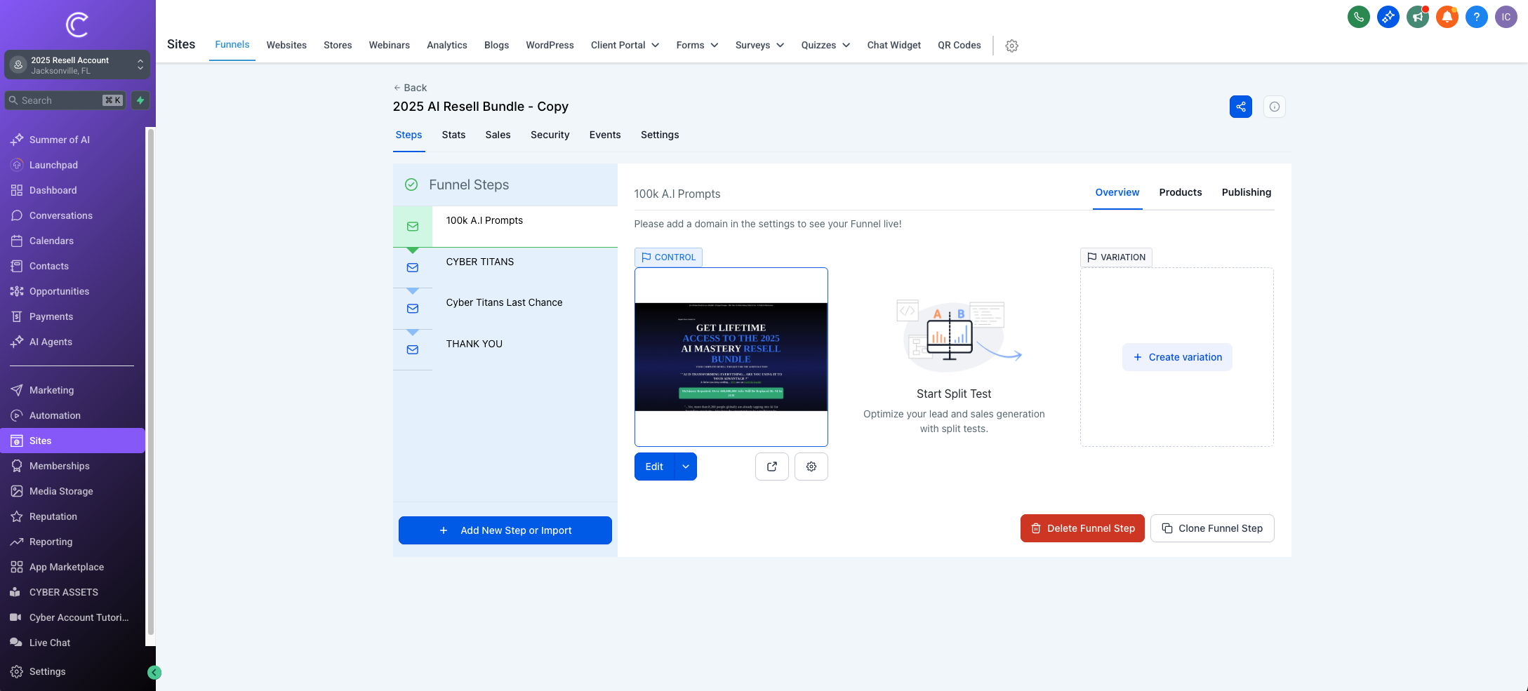Add or purchase a custom domain and connect it to your funnel.